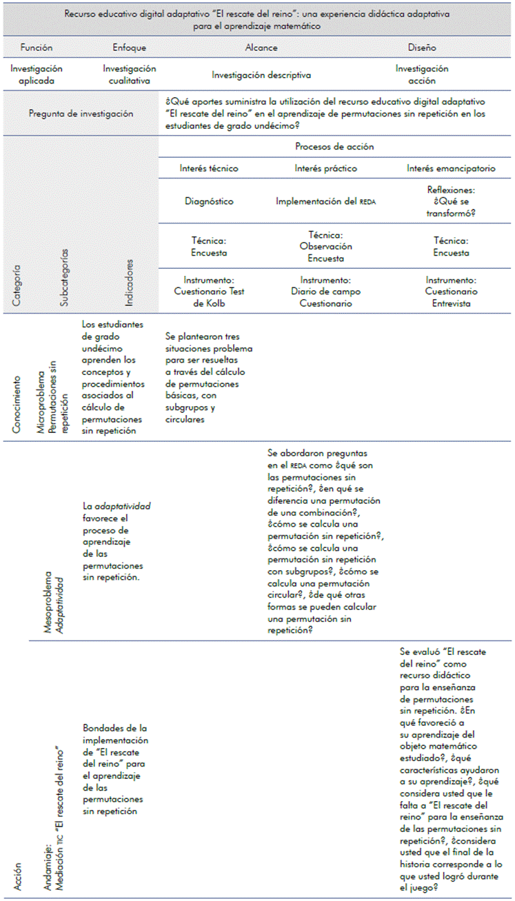 Esta investigación es de carácter cualitativo, en el marco del diseño de investigación-acción (Lewin, 1946). Las fases se desarrollaron en aulas de clase, a través de la interacción entre la población de estudiantes, el docente investigador y el recurso educativo digital adaptativo. Al no poder predecir los resultados se planteó la estrategia de replantear permanentemente las actividades y dinámicas por desarrollar acordes a la intención educativa, siendo la reflexión-acción el valor preponderante de este diseño aplicado. Se implementó en grupo objetivo 116 estudiantes del grado once entre los 16 y 18 años, tres de ellos con necesidades educativas especiales,