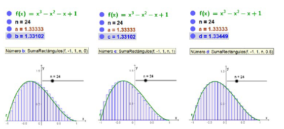 La figura 1 muestra el entorno de Geo-Gebra utilizado por la estudiante para resolver la tarea. La estudiante explora en GeoGebra distintos valores de n, que corresponden a diferentes particiones del intervalo [-1, 1]. En la vista algebraica se muestra el valor de la suma de las áreas de los rectángulos para cada una de las posiciones de los rectángulos: la suma tendrá el valor b, si el vértice superior izquierdo de cada rectángulo coincide con la gráfica de la función; tendrá el valor c, si ahora coincide con la gráfica de la función el vértice superior derecho de cada rectángulo; y el valor de d, si el punto medio del lado superior del rectángulo coincide con la gráfica de la función. El valor de a corresponde a la medida del área de la región.