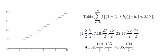 Jiménez y Mejía (2015) trabajaron con diez estudiantes de nivel universitario en tareas centradas en contextos matemáticos, para propiciar que los estudiantes construyeran su concepto de integral definida mediante el desarrollo de una concepción-proceso de las sumas de Riemann de acuerdo con la teoría APOE, y del análisis de una función denominada función de acumulación. Se plantearon tareas para determinar el valor de acumulación de una función en un intervalo dado y para construir una función que permita determinar el valor de estas acumulaciones usando el software Mathematica. Utilizaron una función g definida por g(x) = 2x en el intervalo [1, 10] y realizaron una partición del intervalo; refinaron dicha partición, acumularon una suma de productos de la medida de cada subintervalo y la función evaluada en el extremo izquierdo del mismo.