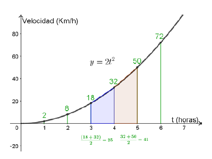 El estudiante utiliza fórmulas de geometría para aproximar el área bajo la curva (figura 3). Cuando el tiempo varía de 3 a 4 horas, determina que el área es 25, y cuando el tiempo varía de 4 a 5 horas obtiene el valor de 41. Estas operaciones indican que el estudiante coordinó los cambios individuales de la velocidad con los cambios individuales en el tiempo, para establecer una nueva variable que es la distancia recorrida, la cual es representada por el área bajo la gráfica de la velocidad, en dos intervalos de tiempo consecutivos. Lo anterior coincide con la descripción de un razonamiento en el nivel de coordinación de valores (Thompson y Carlson, 2017).