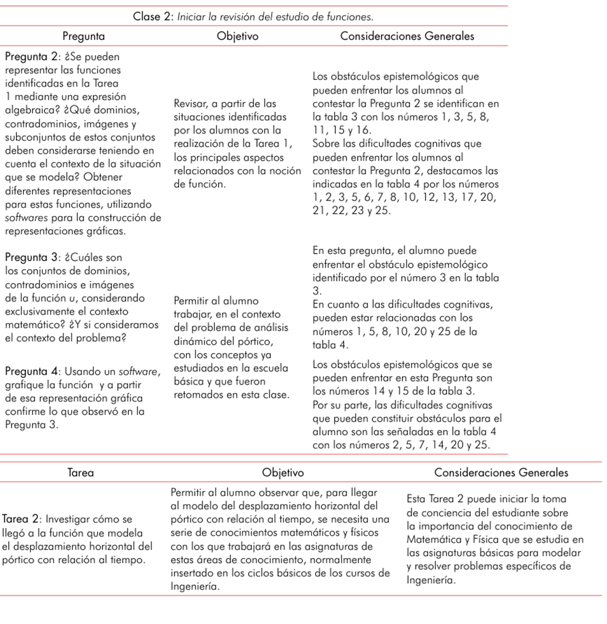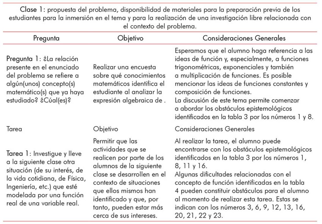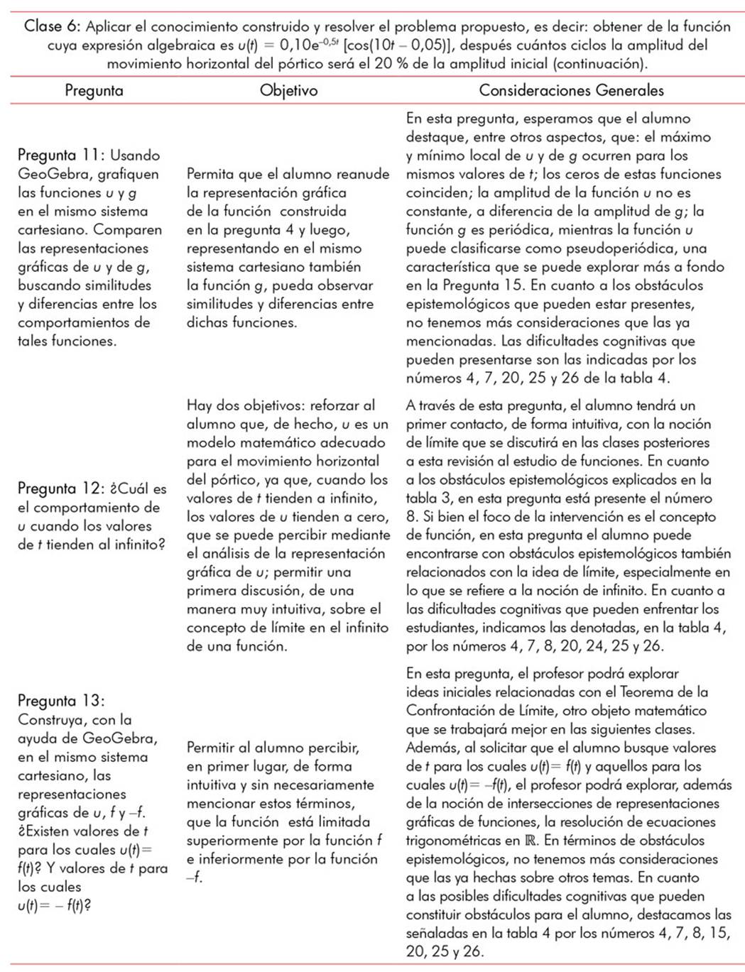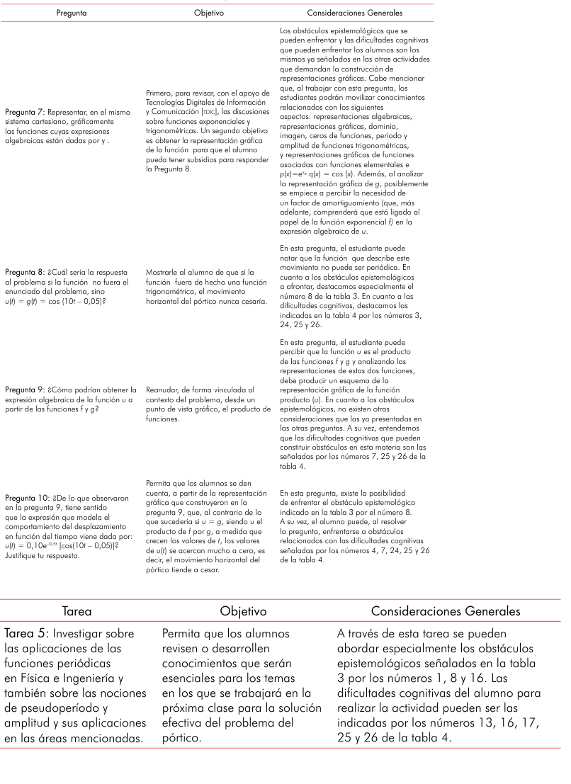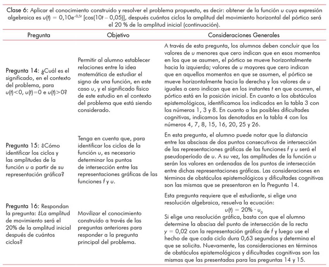 Observamos que, a diferencia de lo que está presente en los problemas de la mayoría de los libros de cálculo, en el análisis dinámico de estructuras, y sin duda en aplicaciones en otros campos, las situaciones no involucran solo un tipo de función; por el contrario, exigen la movilización articulada de distintas funciones y un amplio conjunto de nociones relacionadas con estos objetos matemáticos. En consecuencia, una intervención didáctica orientada a revisar el estudio de las funciones a través de una situación contextualizada en la ingeniería, revisión que en las instituciones donde enseñamos se da en la asignatura inicial de cálculo diferencial e integral (como se detalla en la etapa iii), debe permitir al alumno desarrollar la capacidad de trabajo de forma integrada con los conceptos relacionados con la función.