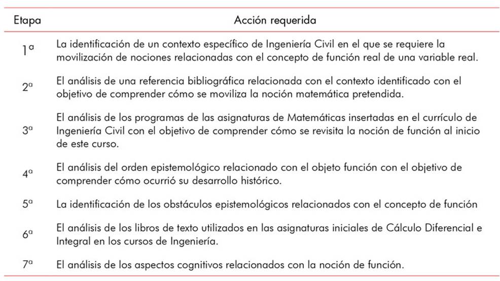 Para el diseño de la intervención didáctica con el propósito de revisitar el estudio de las funciones reales de una variable real, con un enfoque dirigido a la edu- cación superior y las aplicaciones que el alumno encontrará en las asignaturas específicas del curso y en su desempeño futuro profesional, seguimos las siguien- tes siete etapas. Es importante destacar que en los pasos (v) y (vii) se consideran los antecedentes de esta investigación, particularmente en lo que respecta a los obstáculos epistemológicos y las dificultades cognitivas relacionadas con la noción de función.