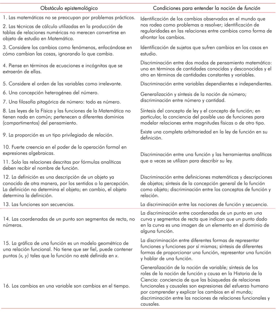 Específicamente en el caso del objeto matemático función, dieciséis obstáculos epis- temológicos han sido estudiados y sintetizados en detalle por Sierpinska (1992). Superar estos obstáculos está ligado a la adquisición de condiciones para comprender la noción de función, como se explica en la tabla 3