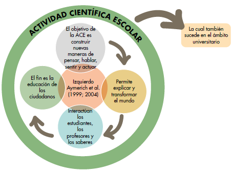 El fin educativo central que da forma a lo que se llama "actividad científica escolar" (ACE) es proporcionar a los estudiantes una cultura científica, sin importar si prefieren los estudios tecnológicos, la ingeniería o cualquier otra rama de la educación superior. La meta de la es construir nuevas maneras de pensar, hablar, sentir y actuar que permitan a las personas explicar y transformar su mundo (Izquierdo et al., 1999; 2004; Aliberas et al., 2021). En la , estudiantes, profesores y saberes interactúan para una educación de la ciudadanía con responsabilidad social (Rodríguez-Pineda et al., 2011), lo que implica el uso activo y flexible de modelos científicos. La también se configura en el ámbito universitario, con características comunes a otros niveles y algunas que le son propias (figura 1).
