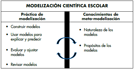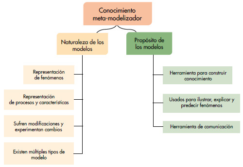 No obstante, incluso cuando los estudiantes participan en la construcción de modelos científicos encaminados a la indagación y argumentación de fenómenos naturales, siguen sin incorporar conocimientos sobre la naturaleza y el propósito de los modelos. A este segundo componente fuerte de una enseñanza basada en modelos lo llamaremos metamodelización (Schwarz y White, 2005; Aragón-Méndez y Oliva, 2020). Así, "el conocimiento de meta-modelización supone comprender la naturaleza de los modelos y de la modelización, lo que implica comprensión acerca del rol de los modelos en las ciencias y del acto de modelizar" (Oliva, 2019, p. 11).