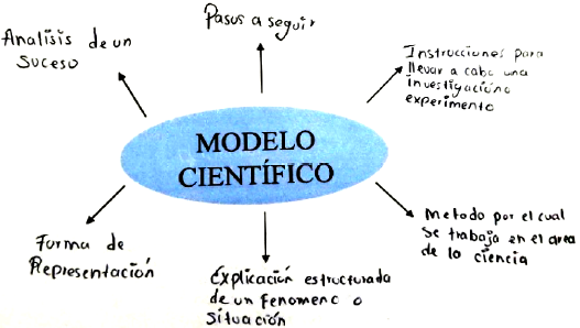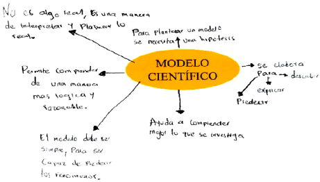 1) Exploración de las ideas iniciales de los estudiantes sobre la noción de modelo científico (MC): en esta fase se solicitó a los estudiantes completar de manera individual un mapa mental (figura 3), escribiendo o dibujando lo primero que viniera a su mente sobre la idea de Posteriormente, los estudiantes se organizaron en grupos con la finalidad de socializar, comparar y revisar los mapas mentales construidos de manera individual, y responder la siguiente pregunta: ¿qué entienden o saben acerca de lo que es un modelo científico?