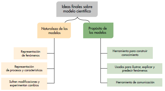 Al revisar nuevamente las ideas finales de los estudiantes sobre el modelo científico (figura 7) a la luz del sistema categorial planteado inicialmente en la tabla 1, se observa que ya no aparece la categoría naturaleza de los modelos como método de investigación. Esto se debe a las diferentes acciones realizadas durante la intervención didáctica, a la conexión o diálogo entre compañeros -donde alternativamente manifiestan sus ideas-, a la lectura del contenido académico provisto y a su análisis -propuesto por el profesor-. Se nota, pues, la progresión en las visiones de los estudiantes sobre los modelos científicos.