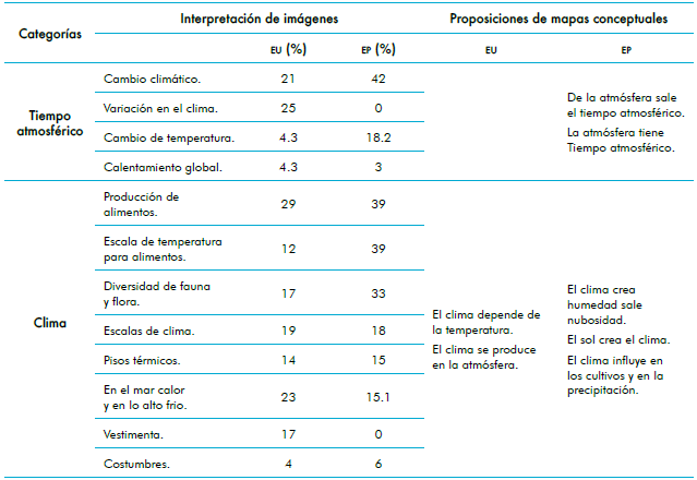 Se evidenciaron conocimientos insuficientes sobre estos dos conceptos (Tabla 3). En la interpretación de las imágenes, el concepto de tiempo atmosférico se confunde principalmente con el CC o la variación en el clima, y las proposiciones realizadas no reflejan una comprensión adecuada del concepto. Respecto al clima, los estudiantes reconocen la altitud y la influencia de la temperatura como factores que facilitan la producción de alimentos y la diversidad de flora y fauna. Sin embargo, mencionaron escasamente otras variables que influyen en la determinación del clima de un lugar.