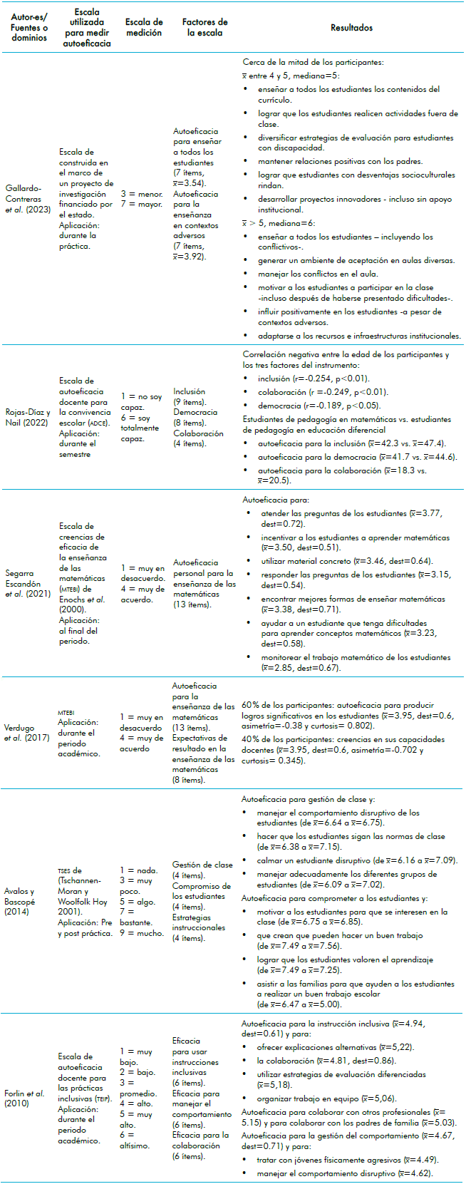 En los documentos hallados se mide la autoeficacia de futuros profesores de matemáticas usando diferentes escalas. Estas describen dominios de actividad importantes para la formación docente. Uno de los dominios refiere a la enseñanza para la diversidad y la inclusión. Gallardo-Contreras et al. (2023) encontraron que la mitad de los participantes tenían niveles bajos de auto-eficacia para enseñar, media de 3.54 sobre siete. Rojas-Díaz y Nail (2022) identificaron niveles medios de autoeficacia para la inclusión; x̄=42.3 sobre 54. Forlin et al. (2010) hallaron niveles no tan altos de autoeficacia para la instrucción inclusiva (x̄=4.94 sobre 6) y de autoeficacia para la gestión del comportamiento agresivo o disruptivo (x̄=4.96 sobre 6).