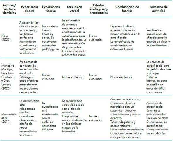 Klein (2023) estudió las relaciones entre la autoeficacia docente, las fuentes de eficacia y el conocimiento pedagógico de profesores de matemáticas en formación. Se realizó un estudio mixto. Se construyó y validó una escala para medir la autoeficacia para planear lecciones, diseñar material, gestionar el aula y usar las tic. Los participantes realizaron práctica de forma virtual durante la última pandemia. Los resultados cuantitativos evidenciaron niveles altos de autoeficacia. El estudio cualitativo informa que la experiencia directa fue la fuente más recurrente en todos los dominios. Le siguieron la persuasión verbal y las experiencias indirectas. La práctica generó diversas experiencias que influyeron en la consolidación de la autoeficacia de los seis casos estudiados. Dos de los casos reportan que el éxito en una experiencia se percibió en el buen desempeño de los estudiantes. La pandemia y la necesidad de adaptar la enseñanza incrementaron la dificultad en enseñanza; dos de los seis casos mantuvieron el esfuerzo y fortalecieron su autoeficacia. Respecto a las experiencias vicarias, los modelos fueron los tutores y los pares; se identificaron estrategias pedagógicas. La observación se hizo de forma directa (tutores) o a través de las experiencias que se reportaban en los seminarios de práctica (pares).