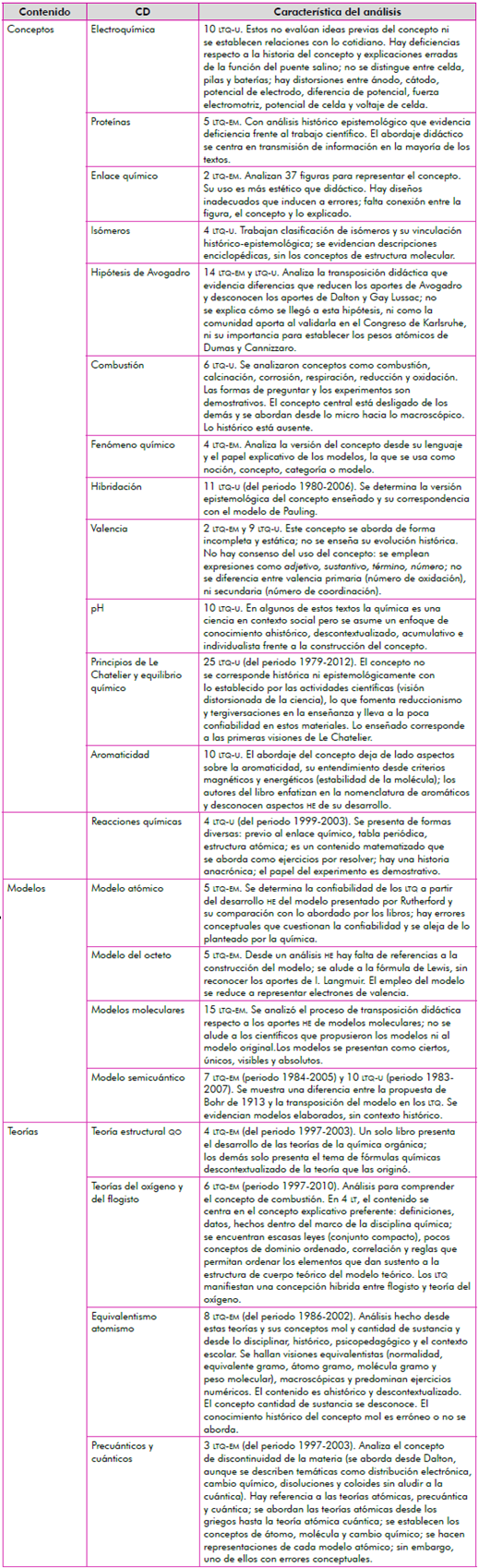 La tabla 2 evidencia los contenidos analizados en términos de conceptos, teorías y modelos de la química, predominando estudios sobre los conceptos (véase la tabla 1). Estos estudios plantean que los conceptos están descontextualizados históricamente y desligados de las teorías de la química (des-contextualización disciplinar), incluso los documentos analizados enfatizan en tal tipología de contenido. La mayoría de trabajos evidencia errores conceptuales o conceptos que hoy la química no usa.