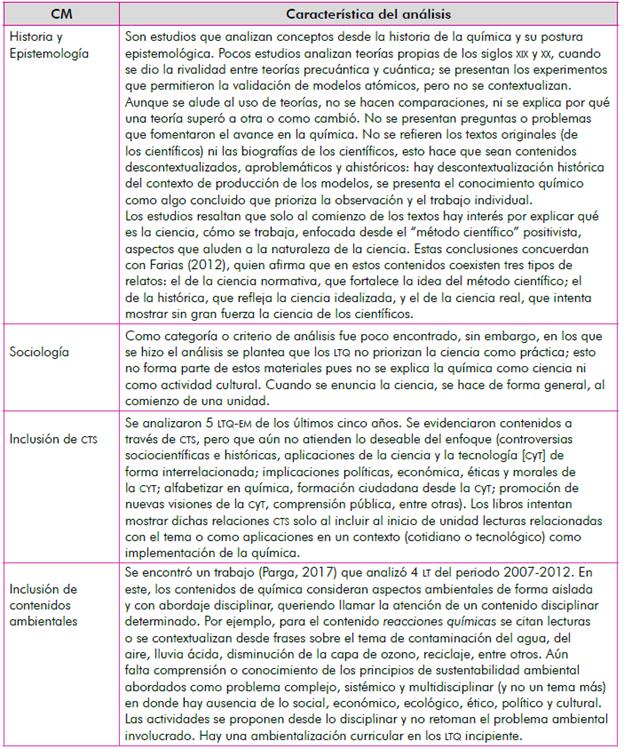 Esta categoría emergió al identificar en los documentos investigaciones que analizan la evolución de los LTQ. Así, se encontró un estudio que analizó seis LTQ para determinar sus características desde los años sesenta hasta hoy (Carrión, 2014). El análisis fue contextual con respecto a la época en que fueron publicados. Como unidades de análisis se crearon categorías como Naturaleza de la ciencia, Contenidos y Modelo didáctico; así, se determinó en qué aspectos han evolucionado estos materiales. El estudio evidenció evolución respecto a la naturaleza de la ciencia y al modelo didáctico, pero no es una evolución altamente deseable, pues los LTQ deberían estar acordes a una enseñanza de la química para el siglo XXI.
