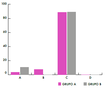 Asimismo, con el fin de determinar la homogeneidad e independencia entre ambos grupos con relación al conocimiento inicial (ideas previas) se ha realizado la prueba chi-cuadrado. Para ello, se comparan las frecuencias observadas en cada una de las opciones de la variable categórica, en nuestro caso respuesta múltiple (a, b, c, d) y grupos (A, B).