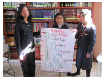 Foto 1: Alumnas mostrando afiche con el número de especies animales y vegetales de Tacna