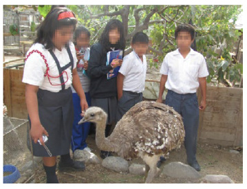Los niños realizaron una visita al zoológico para conocer animales de distribución regional, así como otro tipo de fauna propia del país (foto 2). Algunas de estas especies se hallan amenazadas, como el zorro andino, la vicuña o el suri. Las exhibiciones de animales en zoológicos pueden contribuir a mejorar el conocimiento que los niños tienen de la fauna silvestre, y resultan actividades educativas más exitosas que las que se realizan dentro de la escuela (Miller et al., 2004). Los participantes tomaron fotos y anotaron las explicaciones del facilitador. En la siguiente sesión del taller se recuperaron las impresiones acerca de la visita y cada uno elaboró un tríptico sobre fauna amenazada.