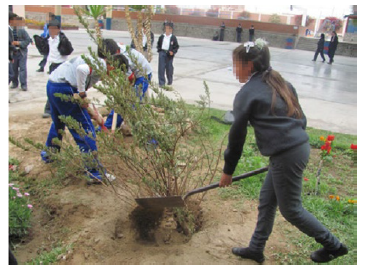 Esta vez se trataba de participar en una actividad de rescate de una especie nativa de la región. Se escogió al arbusto denominado Chuvi (Tecoma fulva), que fue trasplantado desde el desierto hasta el jardín del colegio, donde los alumnos del taller sembraron la planta (foto 3). Posteriormente elaboraron un cartel con su nombre, el cual colocaron junto al arbusto. Los alumnos se comprometieron a cuidar la planta. Finalmente, se publicó una reseña en el boletín virtual de la escuela.