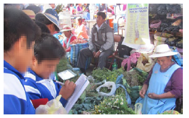 Esta actividad consistió en visitar una feria ambulante en el distrito de Alto de la Alianza, en donde se expenden productos tradicionales provenientes de la zona andina de Perú y Bolivia. Los conocimientos etnobotánicos son muy importantes para los vendedores de plantas medicinales en Tacna, ya que sirven para reconocer y clasificar a las plantas (Pizarro-Neyra, 2013). Los participantes visitaron los puestos de plantas medicinales y les preguntaron a los comerciantes acerca de su empleo e importancia para la salud (foto 4). Como en este caso se trata de niños urbanos, su conocimiento sobre plantas nativas era limitado, incluso la mayoría de ellos nunca habían visitado la feria, y durante el trabajo de campo obtuvieron conocimientos sobre plantas medicinales directamente de informantes clave en el tema. Estos conocimientos luego podrían ser útiles para ellos mismos. Además, surgieron muchas preguntas acerca del valor que tenía este lugar ya que era informal, pero convenimos que resulta importante para la conservación de la diversidad cultural y del uso de productos tradicionales. Los niños posteriormente expusieron su experiencia en otra sesión del taller. Además, el taller de periodismo del colegio editó un video al respecto.