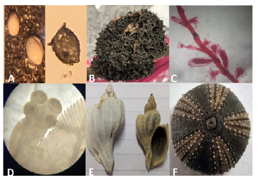 Ejemplos de fotografías de la repentina colección biológica virtual utilizada en el Profesorado en Ciencias Biológicas de la Facultad de Humanidades y Ciencias de la Educación (UNLR, Argentina). A. Protistas: foraminíferos (Pyrgo sp.) y tecameba (Difflugia sp.). B. Porífero de agua dulce (Drulia sp.) (Cnidarios). C. Colonia de hidrozoos (Cnidarios). D. Escólex de Moniezia sp. (Platelminto). E. Moluscos gasterópodos (Trophon sp.). F. Equinoideo regular (Arbacia sp.).