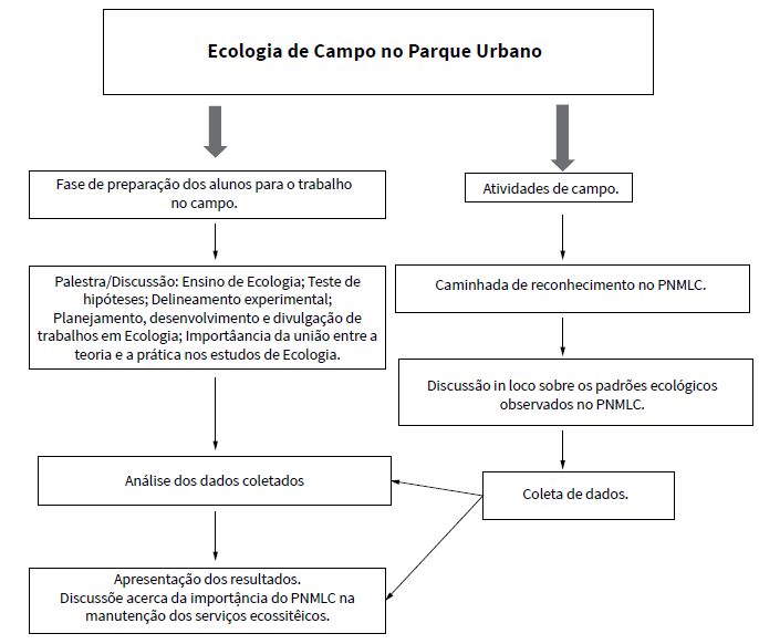 No Brasil, os cursos superiores de Ciências Biológicas apresentam a Ecologia como uma disciplina que trata do entendimento das relações entre os seres vivos e o meio onde estão inseridos. Bem como questões que envolvem problemas ambientais e os rumos da sustentabilidade para a manutenção dos ecossistemas (Medeiros e Bellini, 2001; Scarano e Oliveira, 2005). Portanto, apresentar toda a complexidade da Ecologia, apenas por meio de aulas teóricas e conceituais em sala de aula não é tarefa fácil para os professores. Uma alternativa adotada tem sido o uso de aulas práticas em ambientes naturais, as chamadas aulas de campo. Comumente, os objetivos destas aulas integram o treinamento de atividades de investigação científica que incluem desde o planejamento da pesquisa até a comunicação científica oral e escrita (Corrêa et al., 2004).