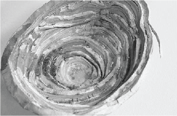 La serie Mine corrupter (véase la figura 2) es una referencia al ciclo de destrucción-creación-recreación que constituye la obra, en la cual Estefanía Gracia utiliza diferentes tipos de arcilla -porcelana, terracota, gres- dispuestas en capas, configurando una mina, dejando que el material empiece a dar sus formas, y surgen grietas que hablan del propio proceso de transformación en la forma. Estas extracciones a cielo abierto, estos grandes huecos circulares en la superficie llevan a Estefanía a imaginar que si se pudiera hacer un molde, llenando estas minas de arcillas, al sacar el relleno se formarían vasijas. Así está conectada esta forma macro con el objeto utilitario que estuvo en el origen de la cerámica.