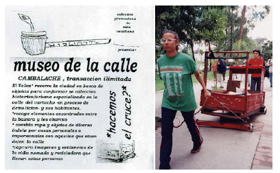 Otro proyecto en esta misma línea de trabajo es El museo de la calle organizado por el Colectivo Cambalache4 en la ciudad de Bogotá, Colombia. Los artistas comprenden la ciudad como un museo que se construye por medio de intercambios, trueques y distribución informal de prendas y objetos cotidianos obtenidos en las calles de la ciudad. Los integrantes del colectivo se refieren a estas formas de recepción de los objetos como "hacer la calle", como si se tratase de entender las dinámicas de la calle como una forma de mediación artística. El museo es un carro de balineras, una especie de carreta móvil con ruedas que debe ser empujada con la fuerza del cuerpo (Véase figura 4). Los miembros del colectivo se refieren a este dispositivo como El veloz, es a partir de estos recorridos que invitan a los transeúntes o residentes de la zona a hacer lo que ellos llaman una transacción ilimitada por medio de la pregunta "¿hacemos el cruce?". Otra de las estrategias de las que se vale el Museo de la calle para invitar a las personas a ser parte de su colección es por medio de un panfleto que dice lo siguiente: