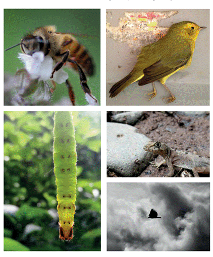 Algunas fotografías registradas no se tuvieron en cuenta en esta actividad; sin embargo, también muestran componentes esenciales del bosque de niebla, como lo es la fauna asociada (figura 4). Desde invertebrados como abejas, orugas y arañas, hasta aves y reptiles, fueron capturados por los participantes en distintos planos y estilos. Según Ochoa-Ochoa y Mejía-Domínguez (2014) , este tipo de ecosistemas alberga una gran diversidad de fauna, representada principalmente por anfibios, aves y mamíferos.