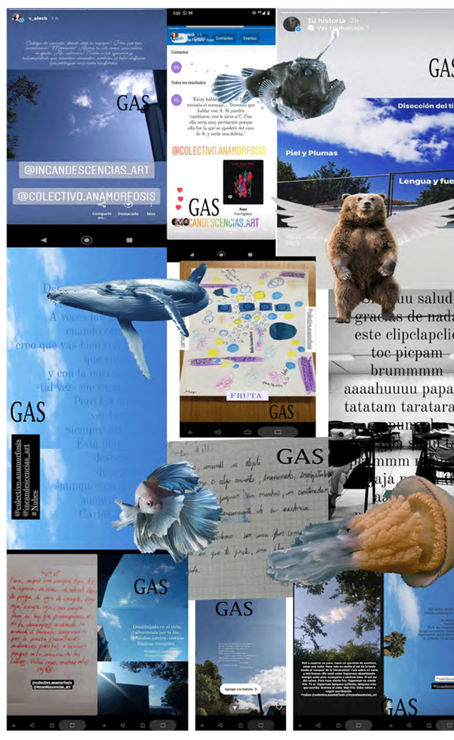 Pero esta forma virtual también se asienta en un montaje de textos que deriva en una suerte de creación colectiva, que se sintetiza en la ilustración 2. Esta imagen, además de aglomerar las creaciones de todas las integrantes de los semilleros en una sola, comprende lo que en nuestro proceso denominamos actas expandidas, o bien, registros y síntesis de nuestras sesiones y ejercicios que, a su vez, expanden el tradicional registro de actas de reunión o actas académicas. Contrario a los modos en que se registra y formaliza la producción de conocimiento en el paradigma científico, Gil y Laignelet ponen en tensión los modos en que esto puede ocurrir en las artes, optando por buscar sus maneras propias acorde al proceso de la creación. En nuestro caso, el acta expandida no solo escapa de la formalidad académica instrumental, sino que indaga por un modo más subjetivo y sensible de registro, en donde se manifiesta un punto de vista propio, lejos de la aparente neutralidad y objetividad del registro académico-administrativo del acta. Además, el acta expandida de la ilustración 2., así como las demás que han creado nuestras monitoras de investigación, son creaciones, excrituras que se suman al devenir del proceso. En este caso, se expande en tanto la operación o estrategia es la de insertar los estados de Instagram creados en el ejercicio, montándolos en una sola imagen, añadiéndole imágenes propias de las afecciones del autor del acta, imprimiendo su sensibilidad.