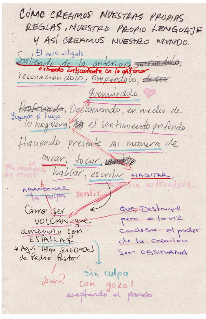 La incertidumbre, la deriva, lo fluctuante como antónimos de los constituyentes de la investigación científica comparten un vínculo con la experiencia, que tiene esos mismos rasgos. Todo lo que es borrado por la racionalidad moderna encuentra un lugar y unos trayectos en la creación plástica, visual y literaria. Lo que históricamente se ha negado a las mujeres, como la rabia, la juntanza y todo aquello que llega a ser considerado no estético con la posibilidad de ensayar, en el sentido de probar, invertir, borrar e incluso ficcionar “fórmulas” también encuentra en la investigación en las artes profundidad y potencia. La lectura de los manifiestos w.i.t.c.h. y Ciberfeminstas de vns Matrix propició una reescritura aterrizada a las realidades singulares que nos habitan y a una experiencia de lectura colectiva, sensible y creativa que le da lugar a los conocimientos de mujeres que se enuncian como brujas desde su capacidad creativa y política de conjurar otros mundos desde la palabra y el performance.