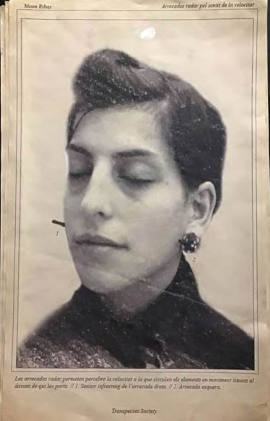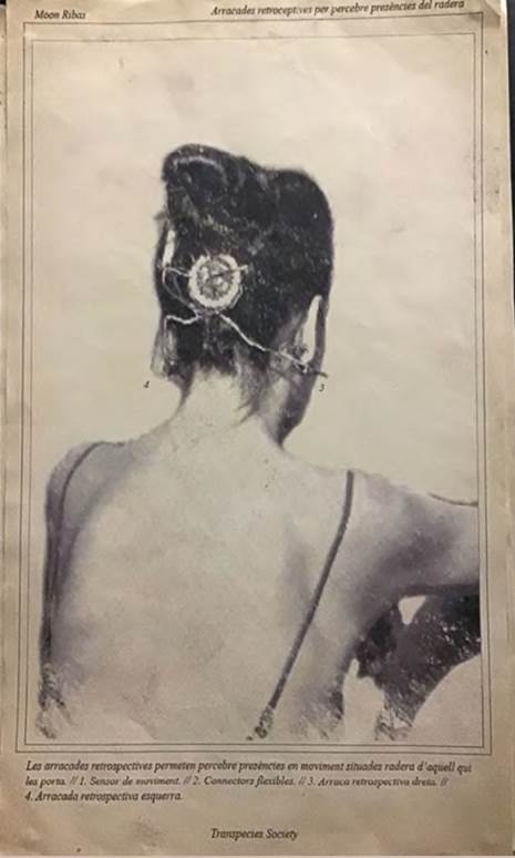 La primera performance cíborg de la coreógrafa y bailarina Moon Ribas data del año 2008; consistía en sentir en su cuerpo la velocidad a la que caminaba la gente en diferentes ciudades. Moon Ribas utilizó un dispositivo equipado con sensores que vibraban en su mano al que llamó Speedborg. Después, este dispositivo, que le indicaba a Ribas qué tan rápidos o lentos eran los pasos de las personas que tenía delante de ella, fue transformado en un par de aretes que le dejaban percibir los movimientos que ocurrían a sus espaldas otorgándole a la artista una especie de retrocepción (Figuras 1 y 2).