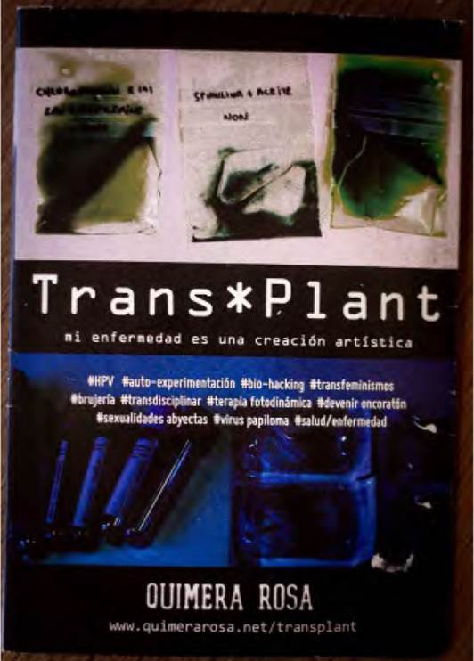 El colectivo Quimera Rosa es mundialmente conocido por llevar a cabo, en el año 2017, una performance titulada Trans*Plant. En esta performance, se hizo una intravenosa de clorofila a un cuerpo humano con el fin de devenir híbrido con las plantas y subvertir la noción de identidad antropocéntrica. Como se observa en el video6 que recopila el acto performático, la clorofila se consiguió después de dos años de intensa investigación y experimentación. Este colectivo refleja las tensiones entre el arte y la ciencia, no solo porque en sus prácticas desbordan la rigidez de los métodos de las ciencias biomédicas y su afán de patentar lo vivo, sino también porque son prácticas de autoexperimentación que no tienen nada de individual. A medida que transcurre la performance, descubrimos que la hipótesis principal sobre los efectos de la clorofila radica en que los ojos y la piel se volverán fotosensibles durante dos meses. En el 2021, Trans*Plant se convirtió en una instalación/laboratorio en el Centro de Cultura Contemporánea de Barcelona. Esta instalación mostraba la dimensión especulativa y ficcional de la performance, en tanto que exhibía el pasado y el posible futuro de esta pieza transdisciplinar a partir de textos, extractos científicos, videos y fanzines (Figuras 6, 7 y 8).
