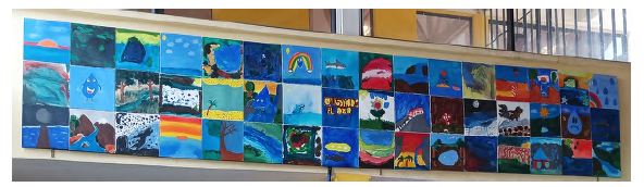 Visualización del Mural Colectivo de Pintura Infantil, instalado en la pared superior del hall de entrada de la escuela rural La Quebrada. Técnica: pintura acrílica sobre 48 telas de 30 x 30 cm. Dimensiones: 90 cm. (alto) x 480 cm. (largo).