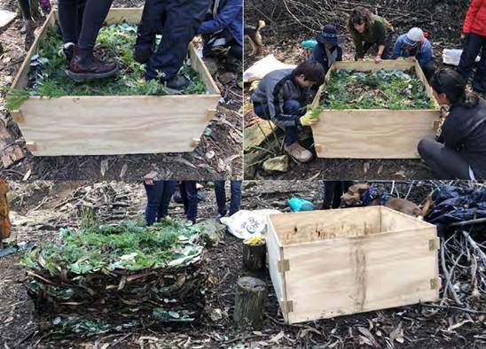 Construcción de infraestructuras en beneficio del ciclo del agua y de los caminantes (p. ej., biofiltros) y regeneración del suelo mediante compostaje (p. ej., pacas digestoras) y huertas, entre otras intervenciones.