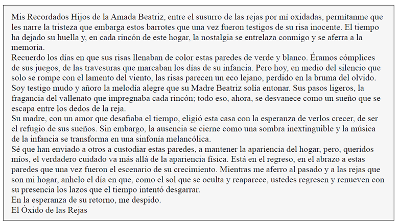 La carta personifica al óxido, transformándolo en un narrador nostálgico que recuerda los días felices y lamenta la ausencia de sus habitantes: “Mis recordados hijos de la Amada Beatriz, entre el susurro de las rejas por mí oxidadas, permítanme que les narre la tristeza que embarga estos barrotes que una vez fueron testigos de su risa inocente” (Carta del Óxido). Este inicio establece un tono melancólico y reflexivo, subrayando la conexión emocional que el óxido, como parte de la casa, tiene con sus antiguos habitantes.