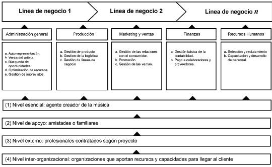 Nota: El modelo muestra que el negocio de los músicos que fueron parte del estudio se encuentra conformado por cinco áreas funcionales. Estas áreas son la administración general, producción, marketing y ventas, finanzas y recursos humanos. Con indepen dencia de la cantidad de líneas de negocio, el modelo es el mismo para los casos estudiados. Además, se identifi caron cuatro niveles de gestión que vinculan las distintas actividades de negocio del músico y que sostienen las diversas líneas. Fuente: elaboración propia.