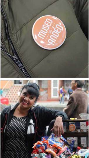 Los creadores de la propuesta, profesores y estudiantes, investigaron a fondo el proyecto del alcalde, revisaron el código de policía y empezaron a observar la calle 42. Para ellos era importante resaltar las relaciones que se habían establecido durante varios años entre los vendedores informales y las personas que hacían parte de la Universidad. El vínculo entre estos dos mundos, mediado por la cotidianidad, por las historias personales "como la de Gloria, una vendedora que tiene un hijo con síndrome de down que encuentra en la venta informal un horario flexible de trabajo que le permite obtener una retribución económica y poder cuidar de su hijo" (Toledo, 2019). El Museo del andén se propone como una plataforma que estudia las relaciones de intercambio cotidianas del espacio público: Un museo que tiene por colección: "las historias, experiencia y saberes de los vendedores informales entendiendo esto como un patrimonio de la ciudad" (Toledo, 2019). El museo del andén se potencia con prácticas (Véase figura 5), como los pines y banderines con el logo del proyecto que buscaban que los vendedores informales pudieran ser identificados como integrantes de él o la realización de un plegable que permite reconocer el territorio que configura el museo, los sitios que ocupa cada vendedor y las historias de la calle narradas desde sus puntos de vista como integrantes del museo. De manera que este es un museo que no contiene una estructura física, sino que está en expansión y entiende la calle como lugar expositivo en el que lo que interesa exponer son las relaciones cotidianas de los vendedores, se trata de un museo vivo en constante crecimiento que acoge las dinámicas sociales de su contexto.