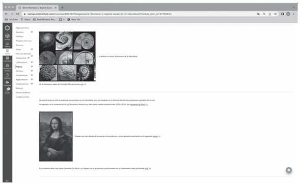 El tercer método invita a volver a vincular los contenidos geométricos y los elementos geométricos de la naturaleza mapeados durante el taller, con el trabajo de artistas y con contenidos de las artes visuales, para promover y potenciar el aprendizaje sobre historia y teoría del arte. Por ejemplo, en el módulo 3, la espiral áurea se relaciona con pinturas de Leonardo Da Vinci (1452 1519) (figura 18) por medio de vínculos a otras páginas y a un video. En el módulo 5, el girasol se vincula con las pinturas de Vincent van Gogh (1953-1890) (figura 19) por medio de imágenes y enlaces a otras páginas (1 y 7). En el módulo 6, se invita a usar materiales pictóricos para pintar la estructura del girasol con el círculo o rosa cromática (figuras 22 y 23), con el objetivo de promover, través de la práctica, el aprendizaje de la teoría del color.