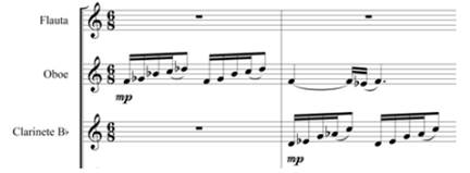 Para Romero, los grandes géneros populares del siglo XX son en su mayoría escritos en compases binarios y argumenta que una de las dificultades en la internacionalización de la música tradicional venezolana ha sido específicamente su escritura ternaria (Pacanins, 2009, p. 122). Este punto de vista puede explicar algunas de sus elecciones frente a cómo escribir joropos y merengues, en lo cual, generalmente, favorece la escritura en 6/8sobre la de 3/4, comprimiendo dos compases de 3/4 en uno de 6/8, de esta manera obtiene múltip les posibilidades binarias y ternarias simultáneamente. En Merengón, por ejemplo, Romero inicia con un motivo de cinco notas, el cual se intercambia entre el oboe y el clarinete (ejemplo 2). La rítmica de este motivo se identifica como el patrón rítmico característico del ritmo del merengue venezolano, y es la "célula" generadora de los temas que el compositor desarrolla a través de la obra. Al respecto, es importante señalar la compresión rítmica en la notación, donde emplea también la semicorchea como subdivisión del pulso, generando un compás "el doble de largo" (ejemplo 1). Una primera consecuencia de este acercamiento a la escritura está relacionada con la ejecución y percepción del hipermetro que, al generar segmentos más completos por compás, permite expresar y comprender con mayor claridad la frase musical. Al respecto, el músico e investigador Emilio Mendoza (2014) comenta: