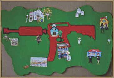 Aquí la integración que señala Gadamer (1991) como componente de la fiesta ya implica un proceso educativo al interior de la institución. Lo que los estudiantes hacen, sus diseños y elaboraciones artísticas, alcanzan el carácter de lo colectivo, desde la singularidad de su propia creatividad. Este trabajo cartográfico permite advertir que los estudiantes no asumen la idea del país de manera abstracta sino desde la percepción de un territorio afectado por la violencia con detalles muy específicos: son justamente los lugares de reunión de la comunidad los que más se ven afectados.